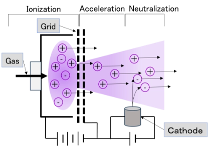 이온소스는, ①이온의 생성(Ionization), ②이온의 가속(Acceleration), ③이온의 중화(Neutralization)의 3개 영역으로 구성되어 있습니다.