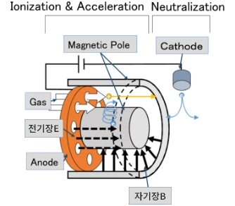 홀가속형은, 자기장과 전기장이 교차되도록 설계되어, 이로 인해 카소드원에서 방출된