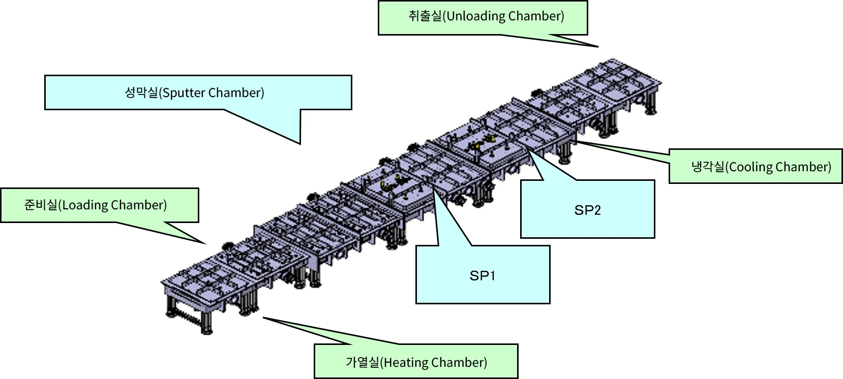 - 1. Loading Ch., Sputter Ch., Unloading Ch., Heating Ch, Cooling Ch. 의 5 챔버 구성